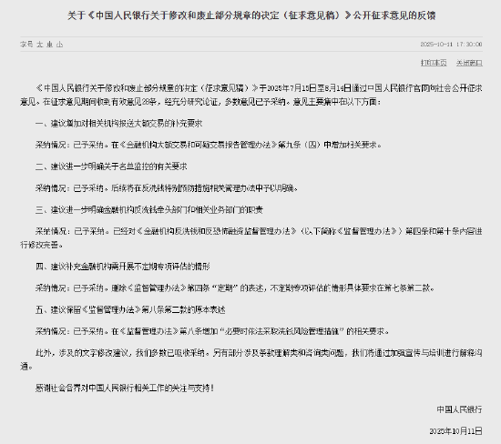 10月11日金融一线消息,央行发布关于《中国人民银行关于修改和废止部分规章的决定(征求意见稿)》公开征求意见的反馈。《中国人民银行关于修改和废止部分规章的决定(征求意见稿)》于2025年7月15日至8月14日通过中国人民银行官网向社会公开征求意见。在征求意见期间收到有效意见28条鑫创国际,经充分研究论证,多数意见已予采纳。意见主要集中在以下方面: